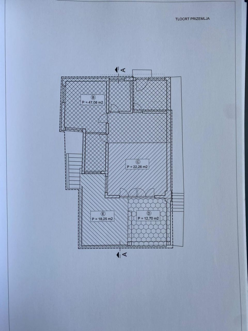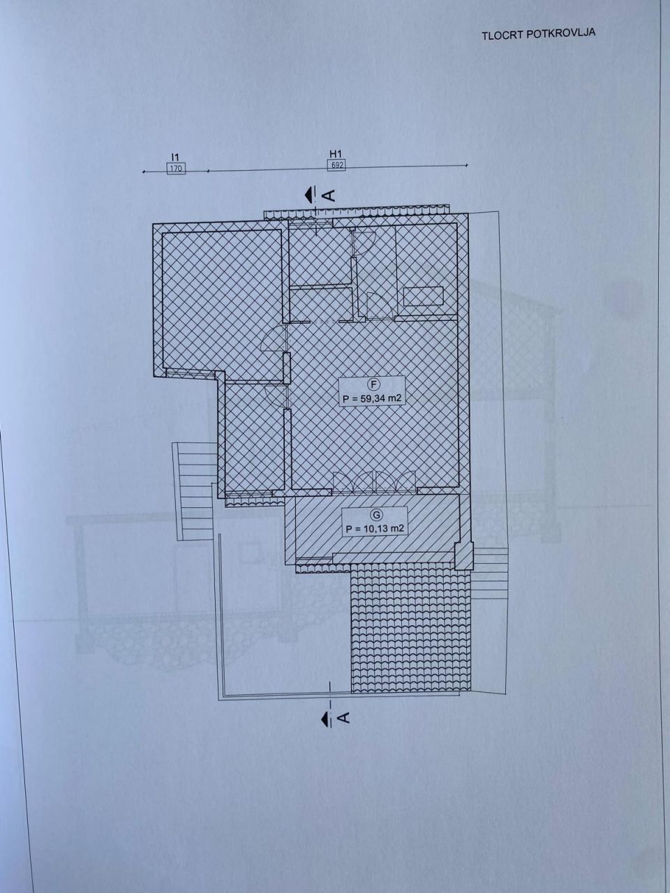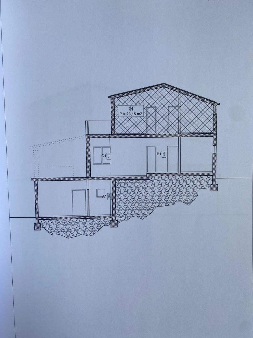 In the basement of the house there is a small garage and a room with a bathroom and a kitchen. On the ground floor there is a living room with a kitchen, a bathroom and a dressing room, a large terrace on the front and back of the house. On the 1st floor there is an unfinished roh-bau apartment with one bedroom, a bathroom and a toilet.